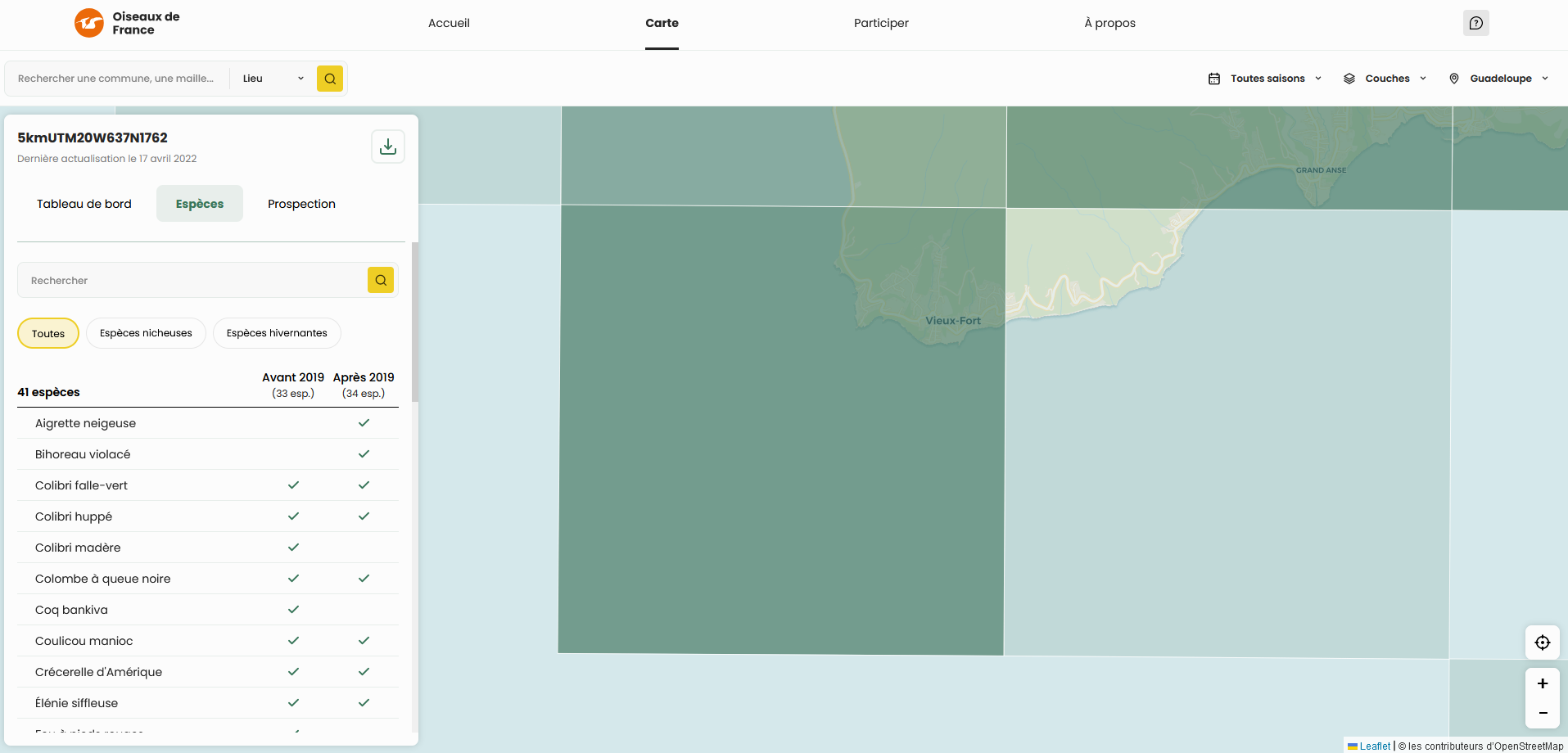 Pour chaque maille, il est possible de consulter les listes d’espèces présentes sur le territoire.